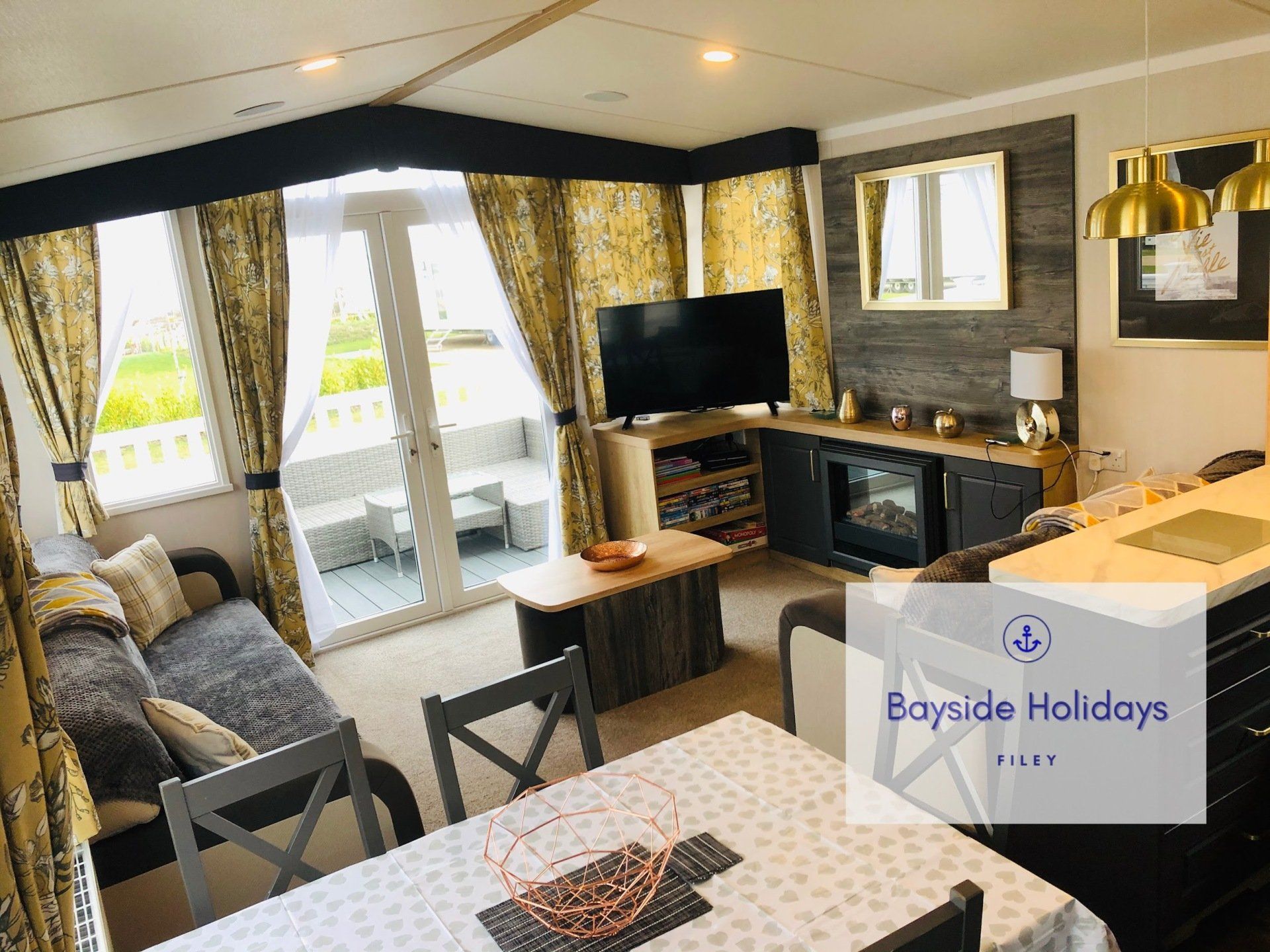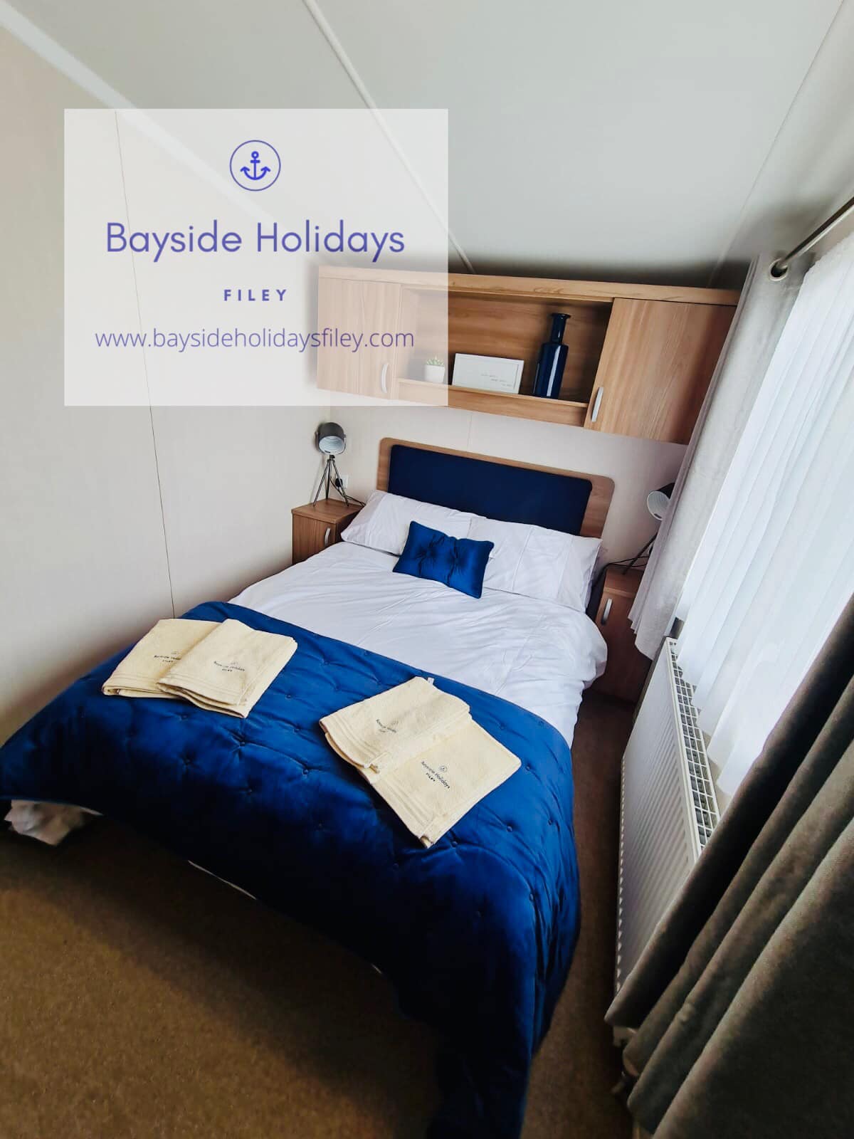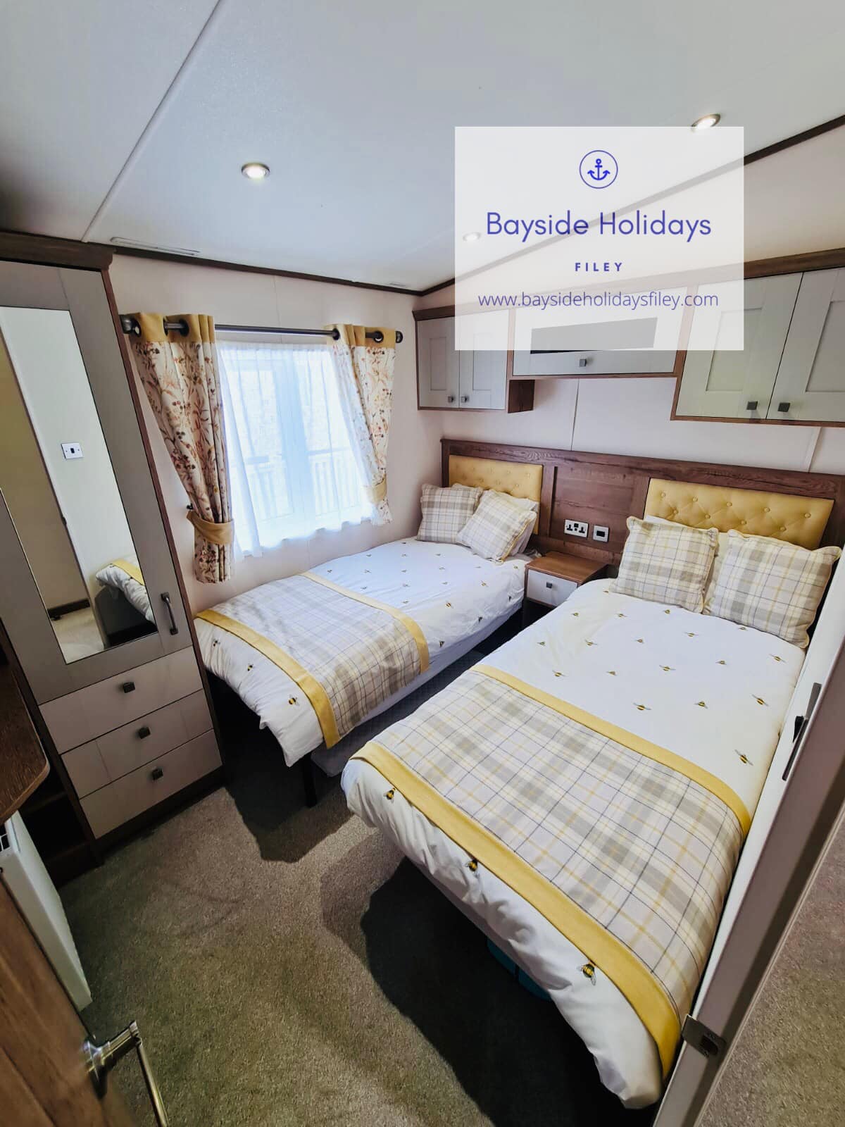 This two bedroom holiday home sleeps up to six guests, with a larger master bedroom than the three bedroom, consisting of a king size bed, two wardrobes, 32inch TV and en-suite toilet. In the lounge are comfortable free standing sofas, situated around a cosy electric fire, with Bluetooth sound system and a 50 inch TV. This caravan has its own WIFI and has TVs in the lounge and both bedrooms. No pets.