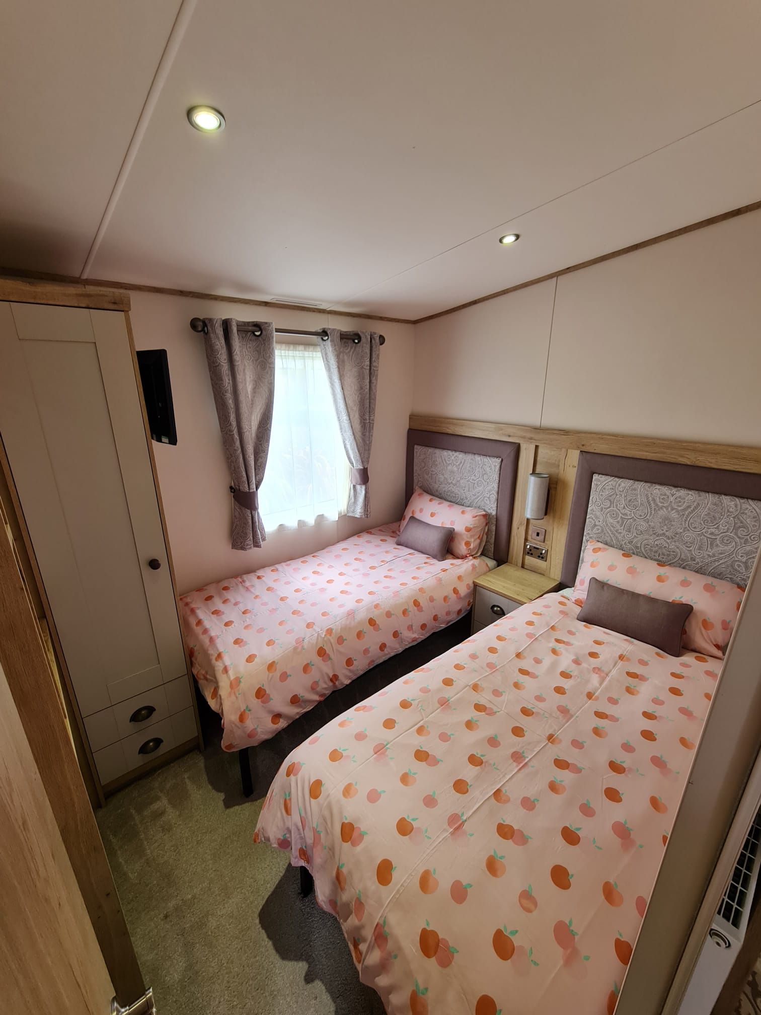 The master bedroom is stunning and contains a Double bed, Dressing Table, large wardrobe and en-suite with toilet and sink with the added bonus of a TV and Dressing Table in the spacious twin room with full size single beds.
