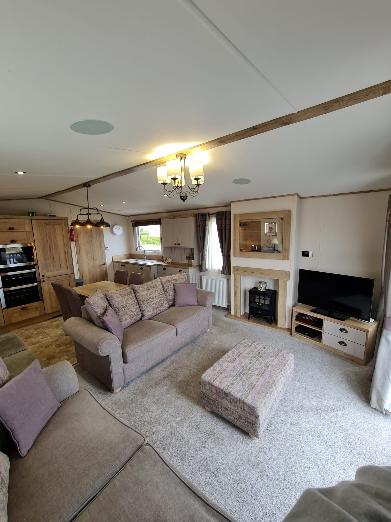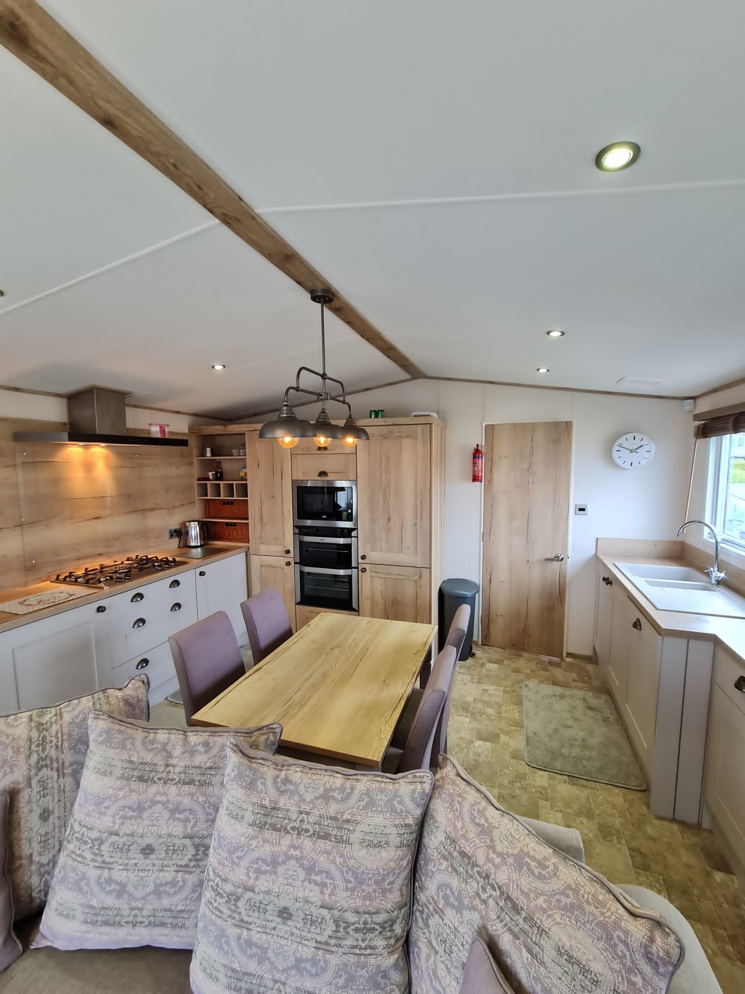 The Lodge Features a Stunning open plan living space complete with a Contemporary kitchen containing a host of luxury integrated appliances including full size fridge freezer, 5 burner gas hob and high level double oven, washing machine, dishwasher and microwave. The kitchen contains a free standing dining table and chairs to comfortably seat four guests