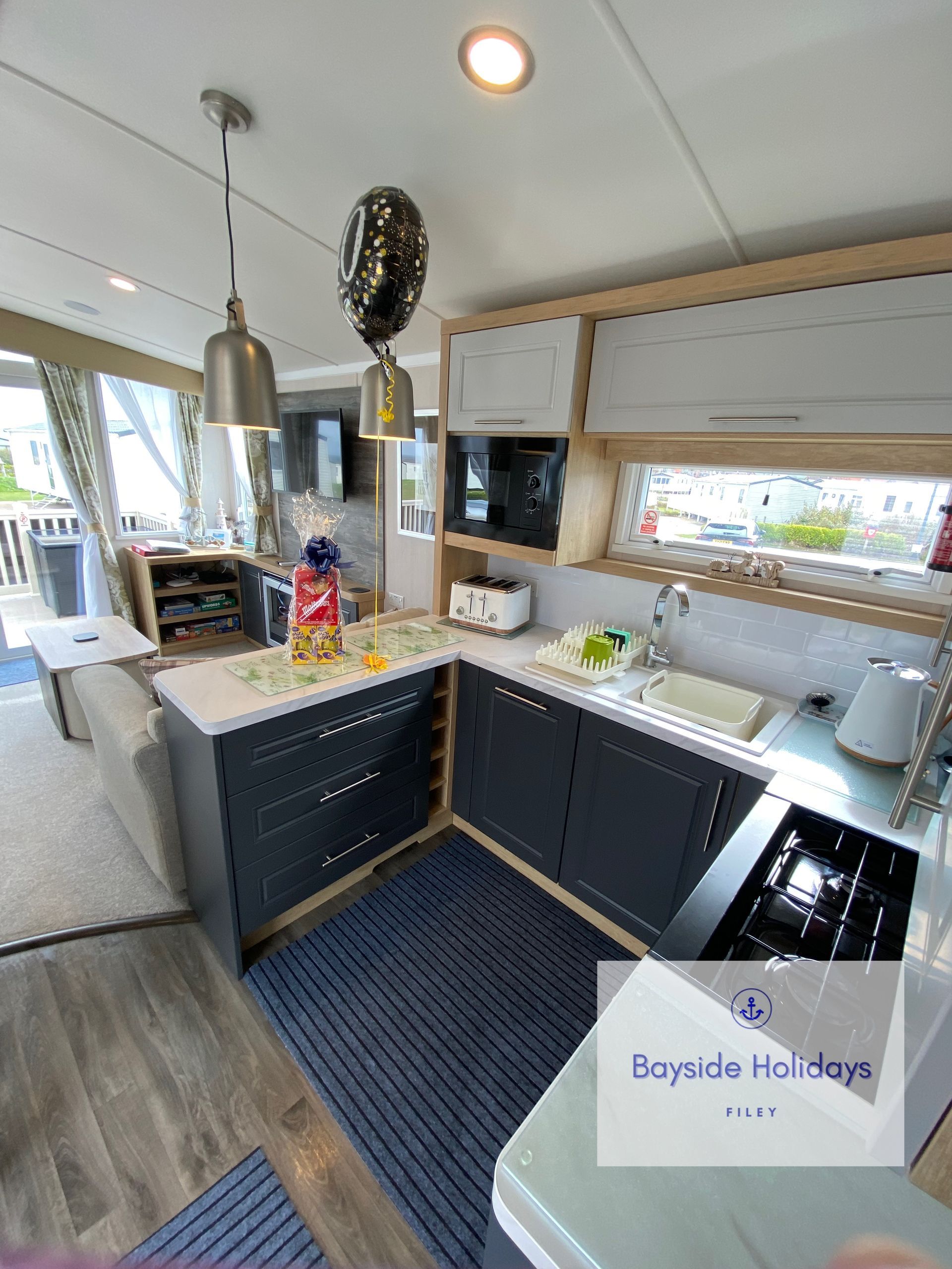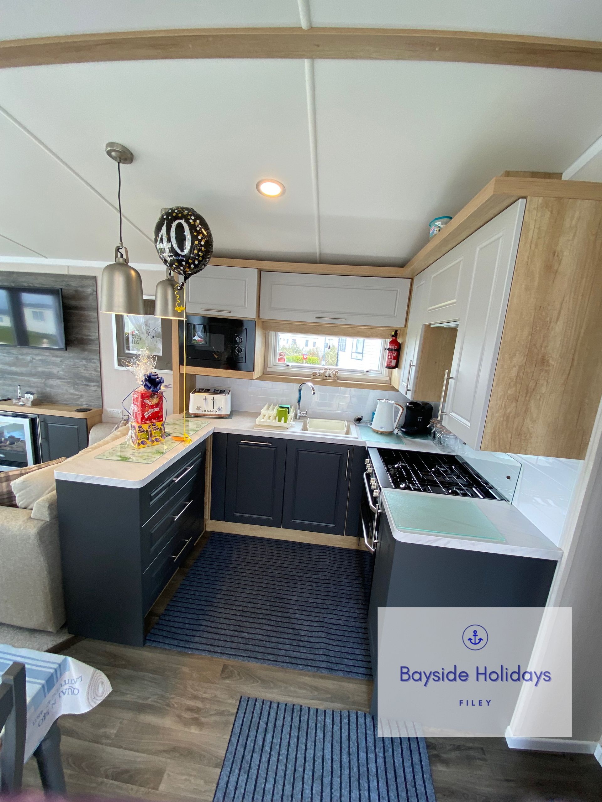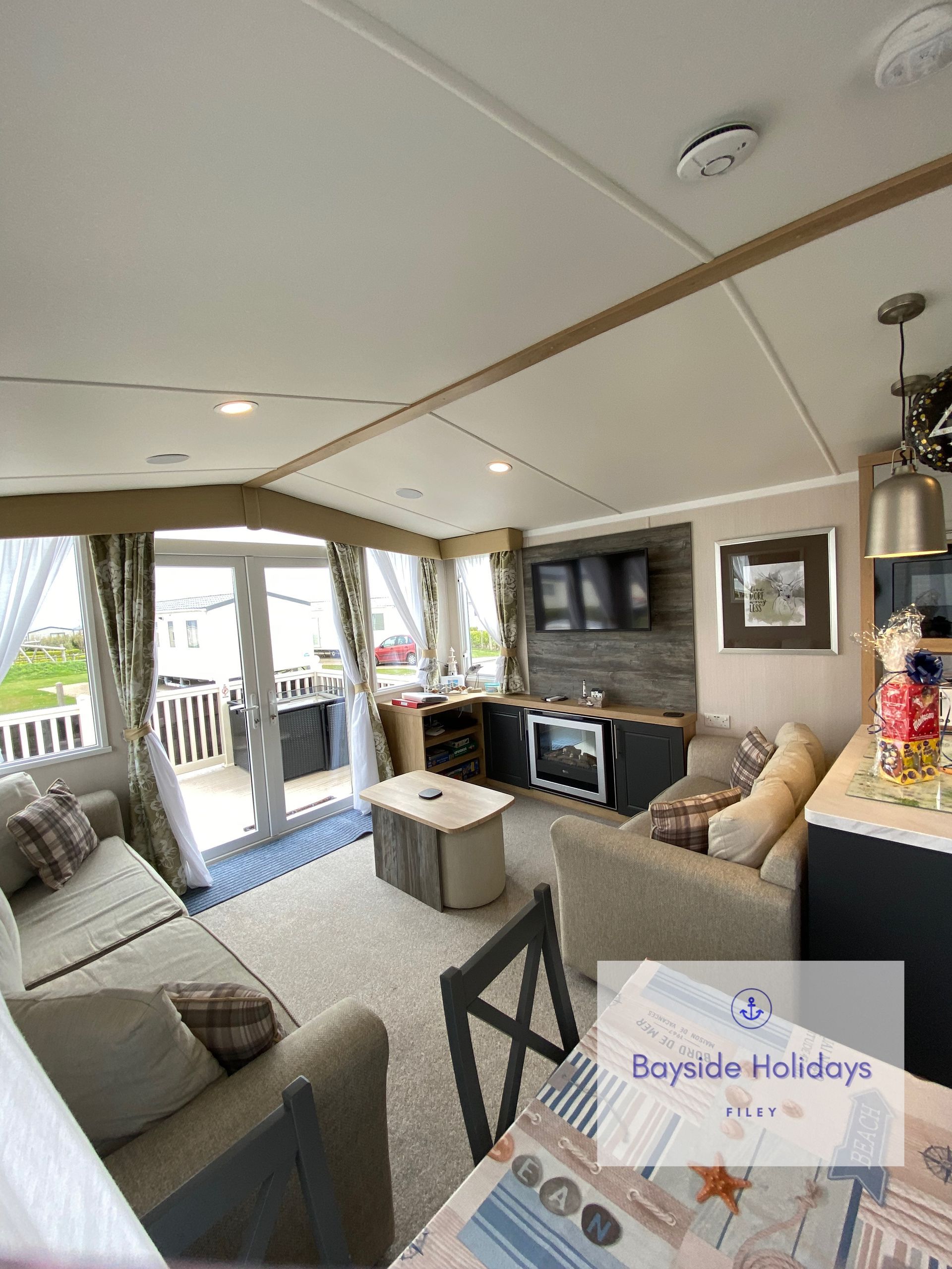 This stunning holiday home is designed to residential specification and is equipped with gas central heating and double glazing. The contemporary open plan living area comes complete with comfortable free standing sofas and a stunning feature electric fireplace.