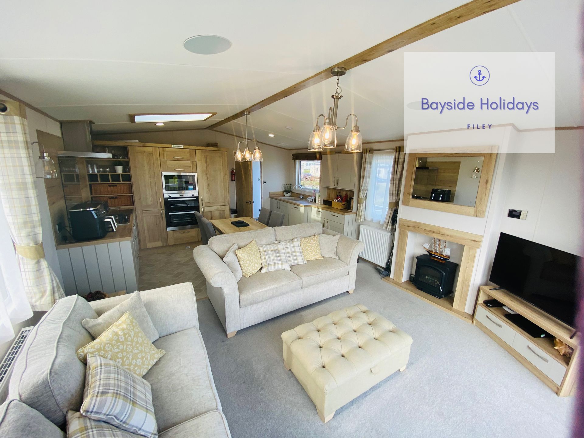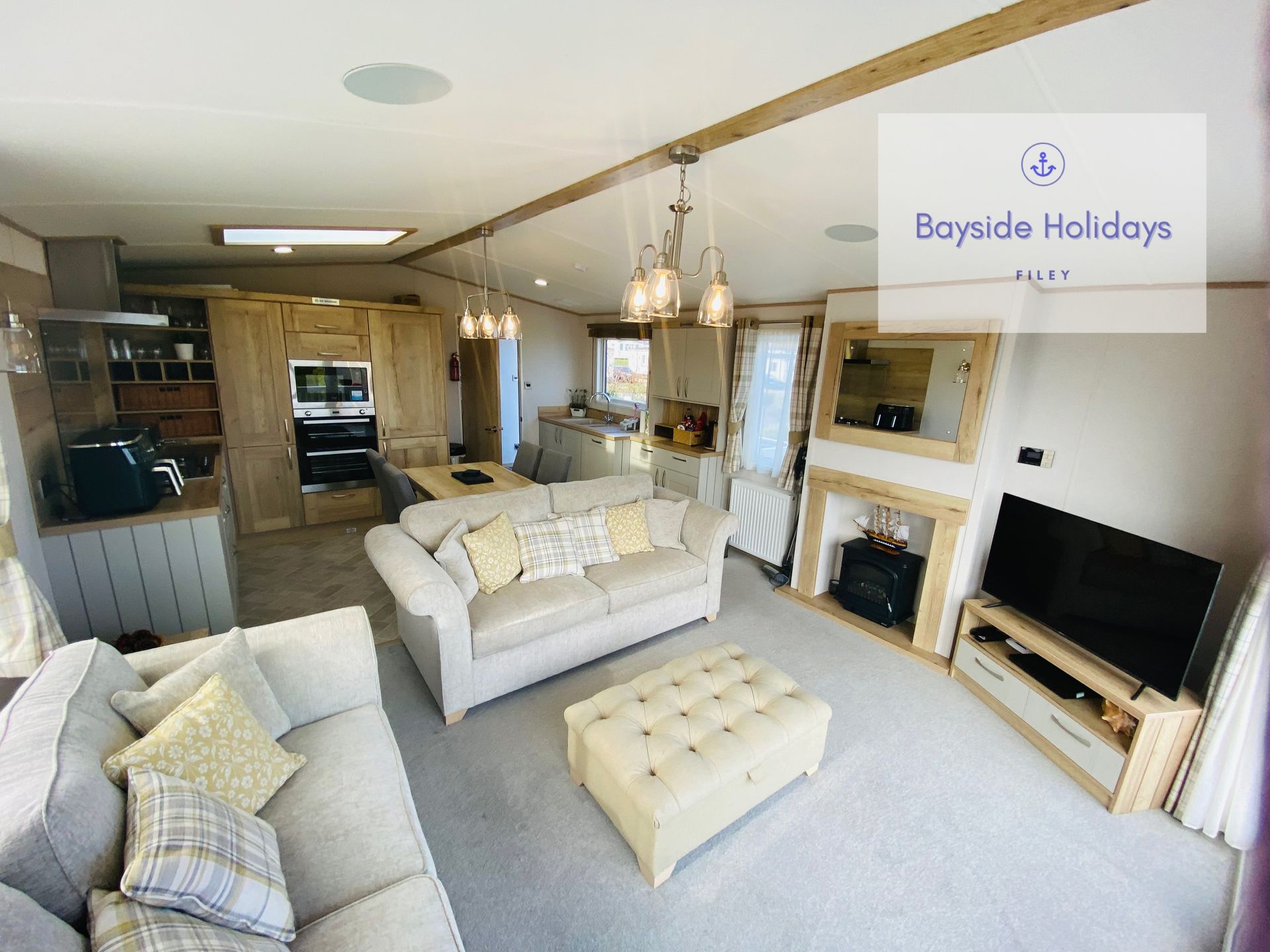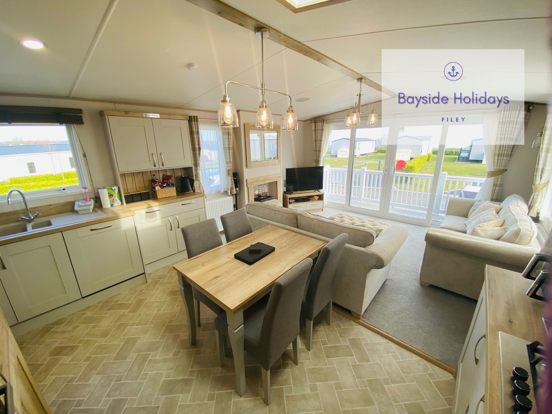 New for 2023 is this absolutely stunning 3 bedroom, 6 berth Seaview lodge with wrap around decking situated on the new seabird's development. This caravan benefits from its own private parking space and gated decking. Furnished and equipped to a high standard this platinum plus lodge offers luxurious and comfortable accommodation. The Lodge features a stunning open plan living space complete with a contemporary kitchen containing a host of luxury integrated appliances including full size fridge freezer, 5 burner gas hob and high-level double oven, washing machine, dishwasher and microwave. The kitchen contains a free-standing dining table and chairs to comfortably seat four guests